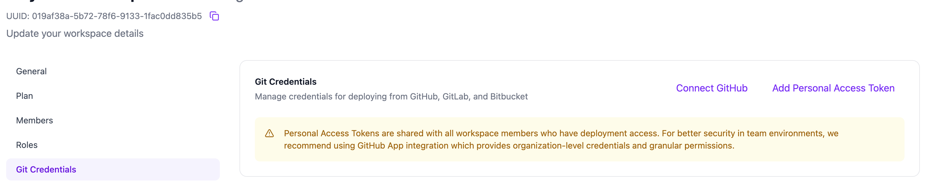 Navigate to your Workspace Settings and select the Git Credentials tab. Click Connect GitHub to begin the installation.