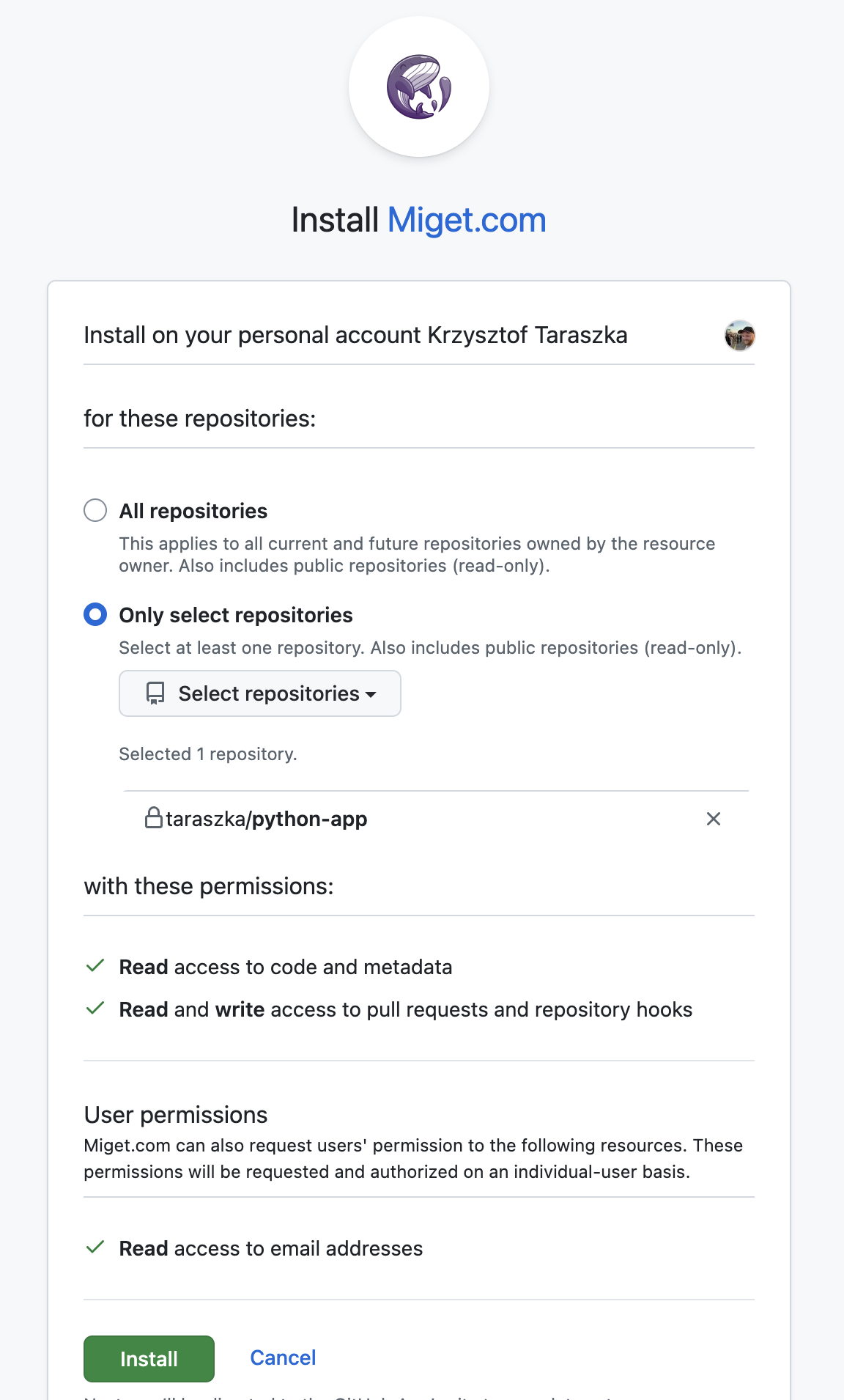 You are redirected to GitHub to install the Miget.com App. Choose where to install it: