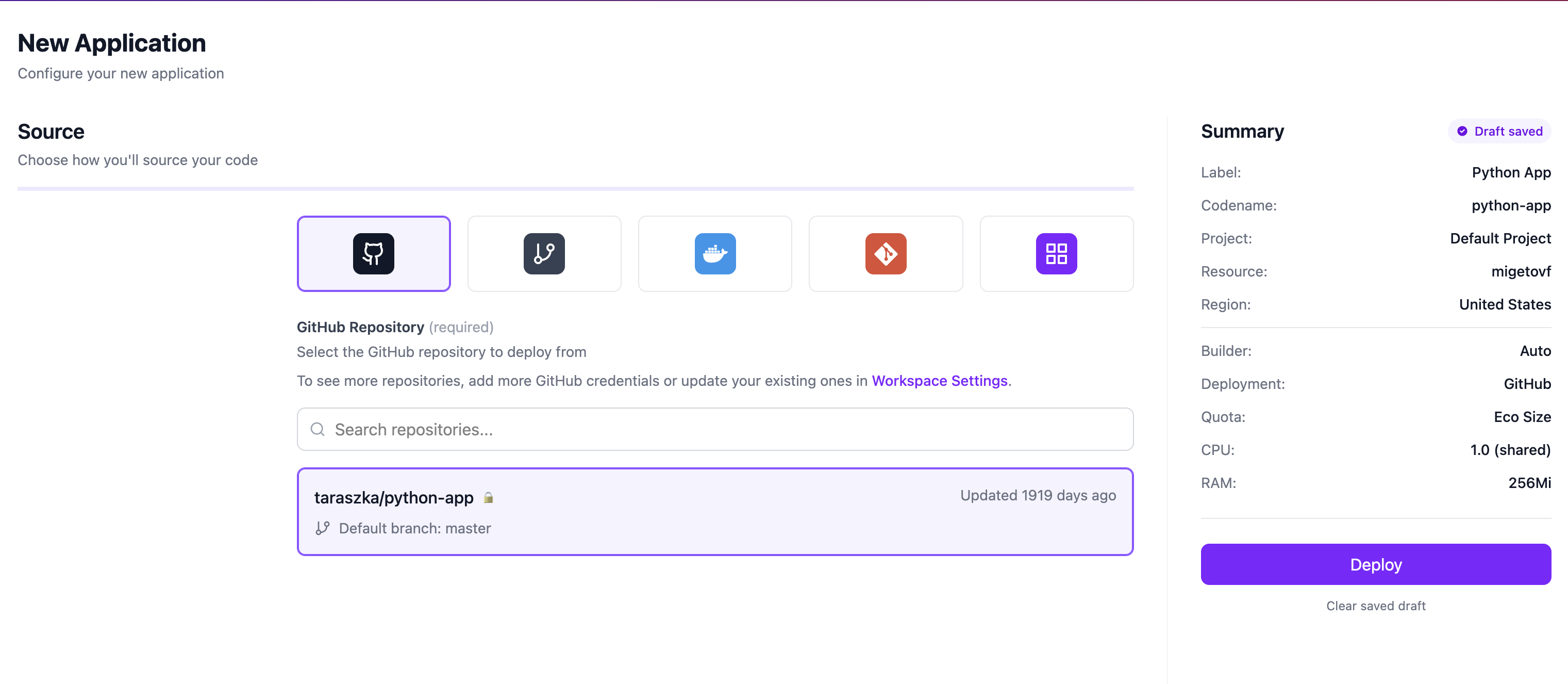 Once the GitHub App is installed, you can deploy from GitHub when creating a new application or changing an existing app’s deployment source.Select GitHub as the source