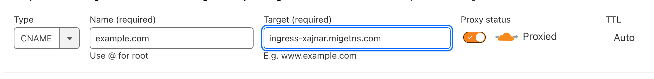 Enable the orange cloud (Proxy status) to route traffic through Cloudflare for DDoS protection and caching.