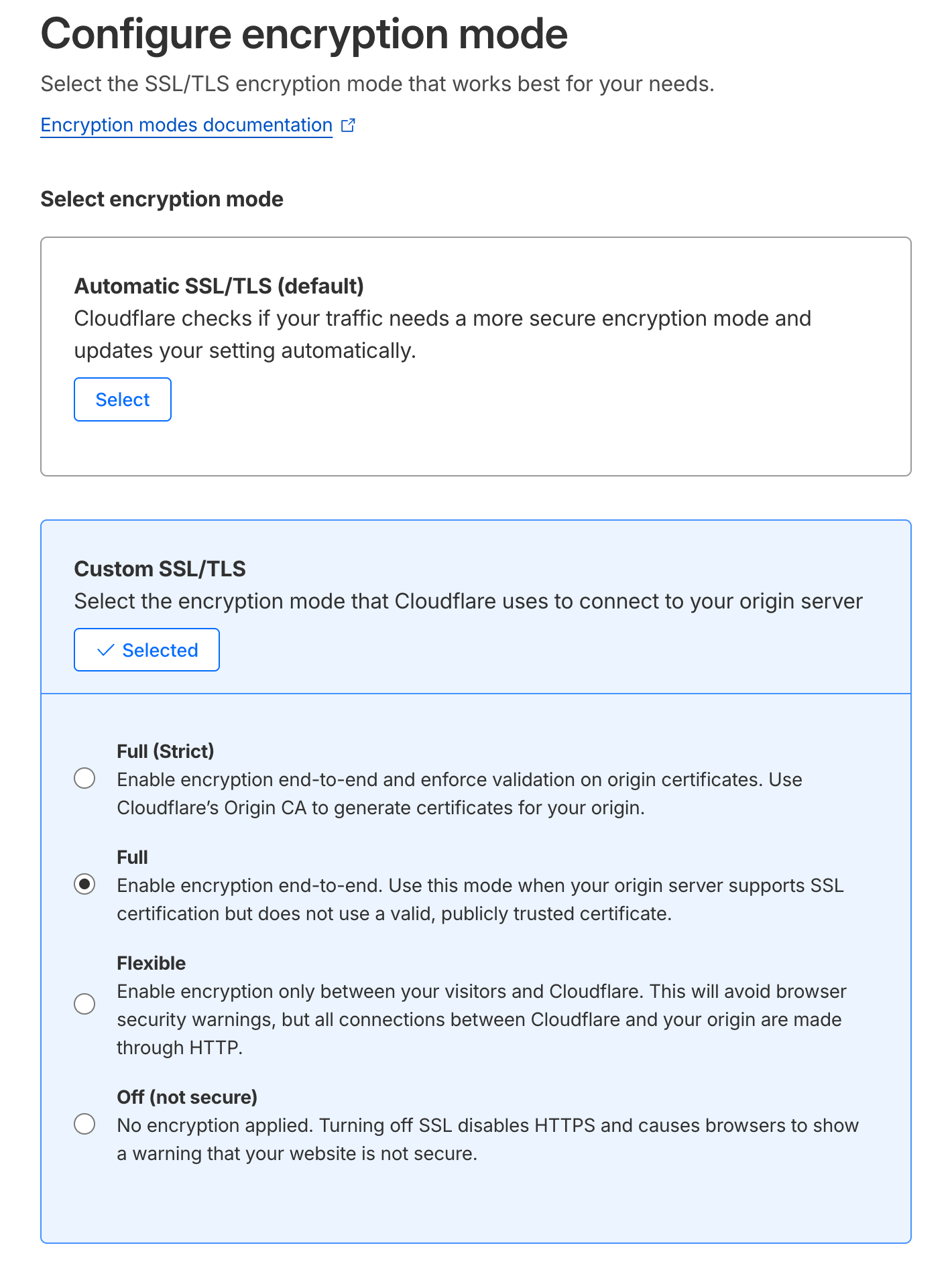- Automatic SSL/TLS (default): Cloudflare automatically detects and applies the most secure encryption mode for your domain.