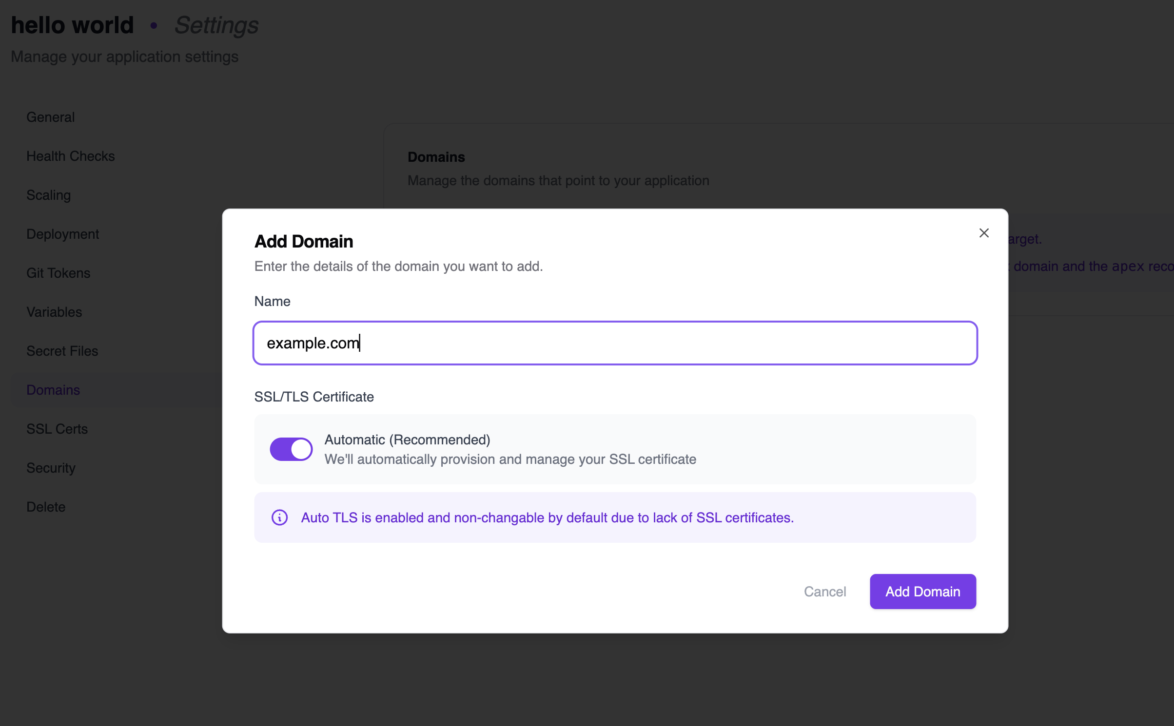 Navigate to your application’s Settings → Domains section and click Add Domain.