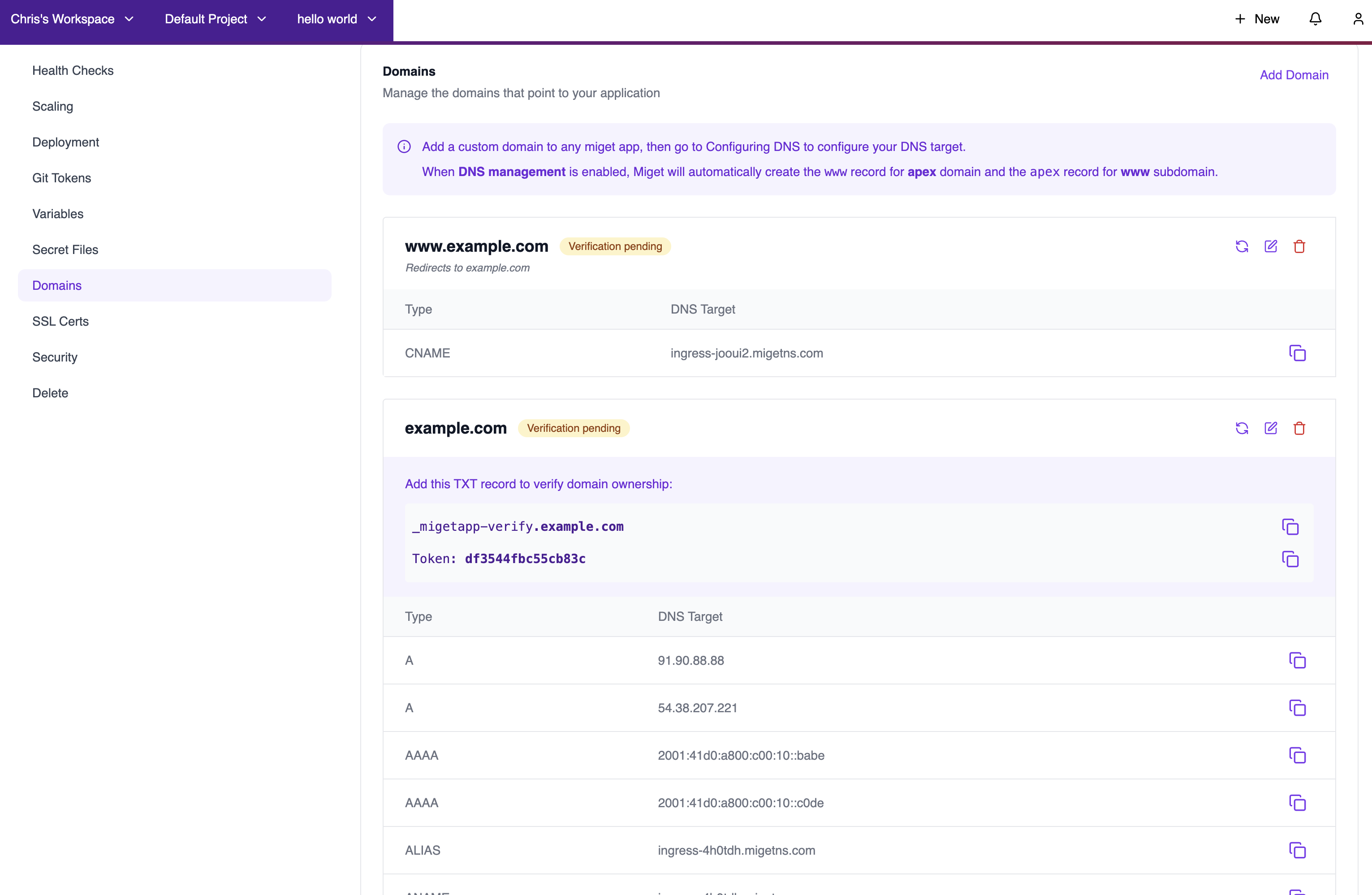example.com), Miget automatically creates thewwwsubdomain record. - If you add a www subdomain (e.g.,