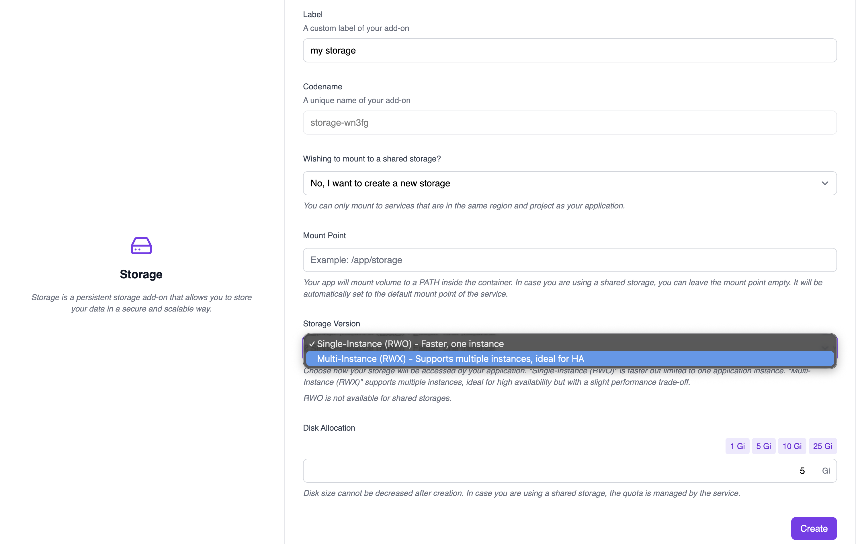RWO is not available when mounting to a shared storage service. - Disk Allocation: Select the storage size using the preset buttons (1 Gi, 5 Gi, 10 Gi, 25 Gi) or enter a custom value. Disk size cannot be decreased after creation.
